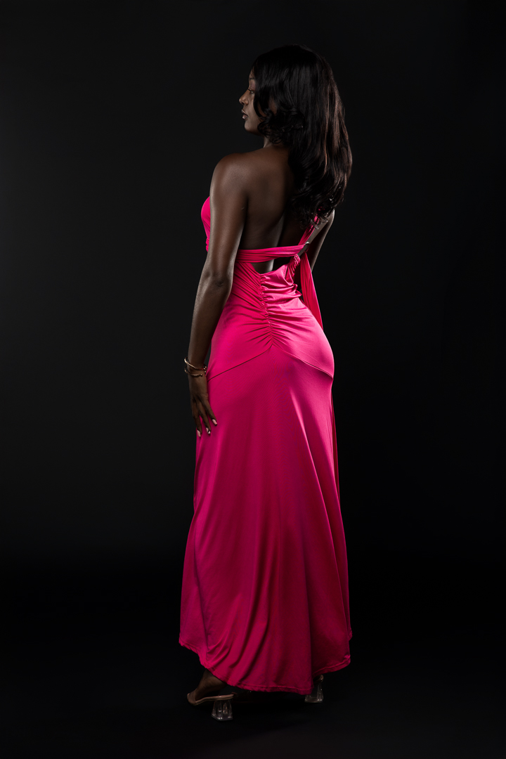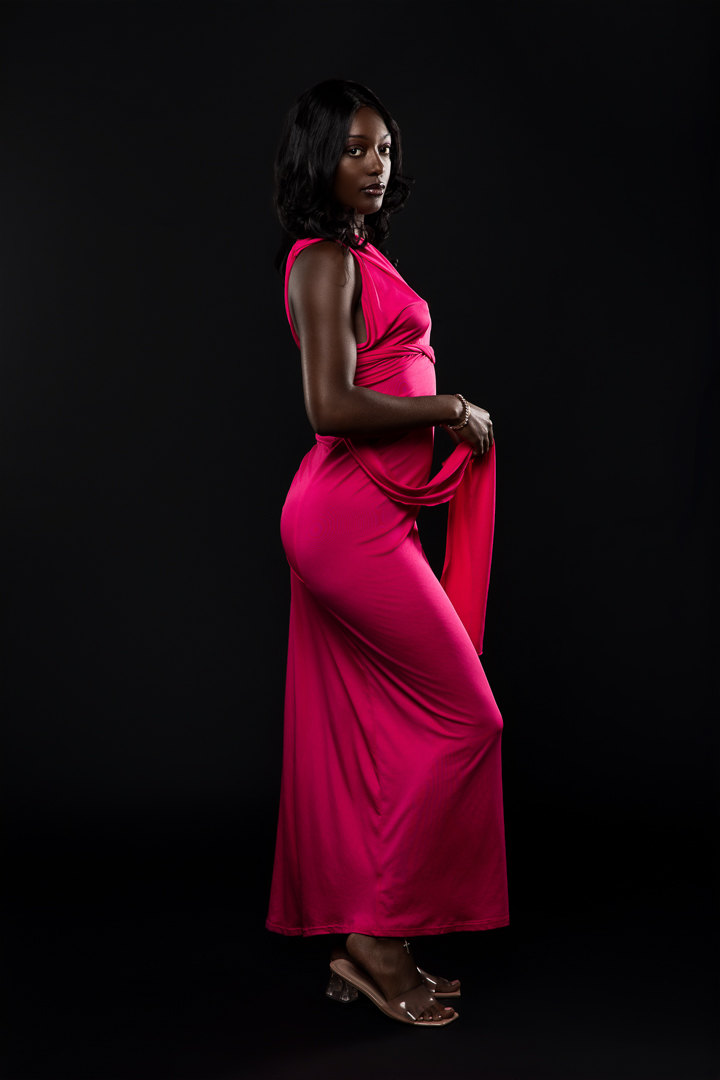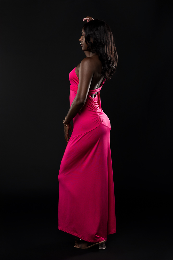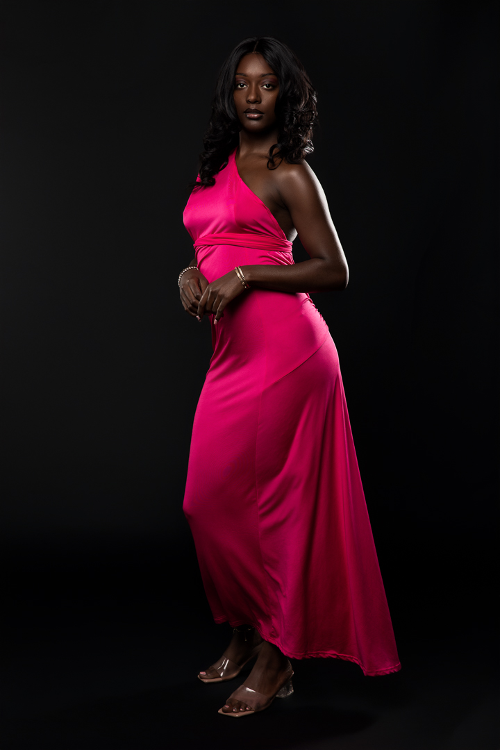 As a passionate photographer with an eye for detail, I recently had the pleasure of orchestrating a captivating photoshoot that beautifully encapsulates the essence of elegance and vibrancy. The model, donned in a striking pink dress, became the centerpiece of this visual symphony against a dark backdrop, an ideal setup for showcasing the rich, lively color of the outfit while allowing the model’s poise and grace to shine.